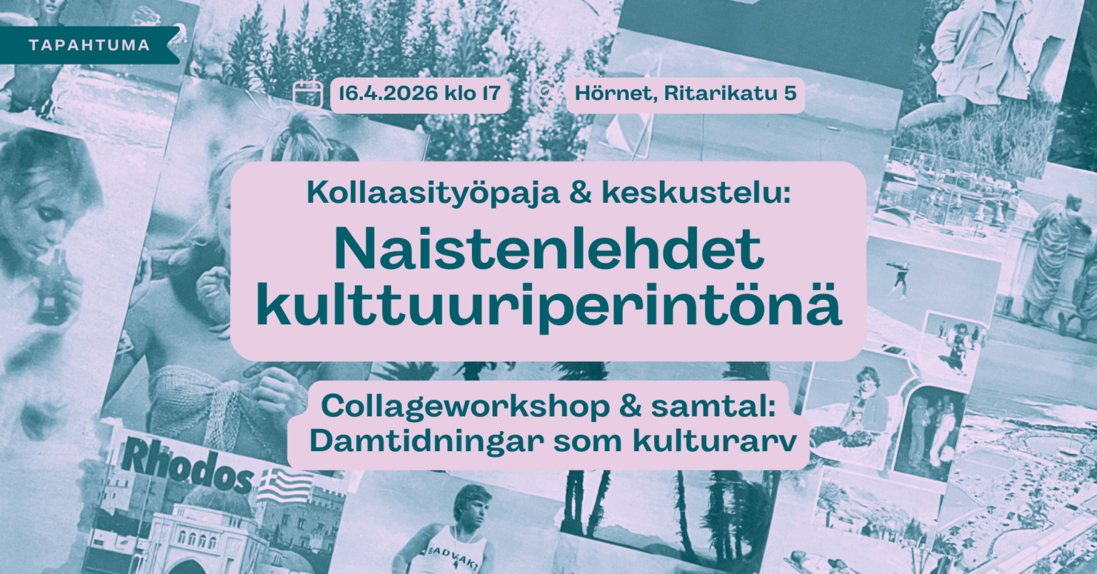 Tutkijat Arja Turunen ja Anna Niiranen keskustelevat osallistujien kanssa muistoista ja kokemuksista liittyen naistenlehtiin. Tutustumme sanomalehtien sisältöön ja luovan uudelleenkäytön mahdollisuuksiin kollaasien avulla. Tarjoamme materiaalit kollaasiaskarteluun ja lisäksi juotavaa sekä pientä purtavaa.