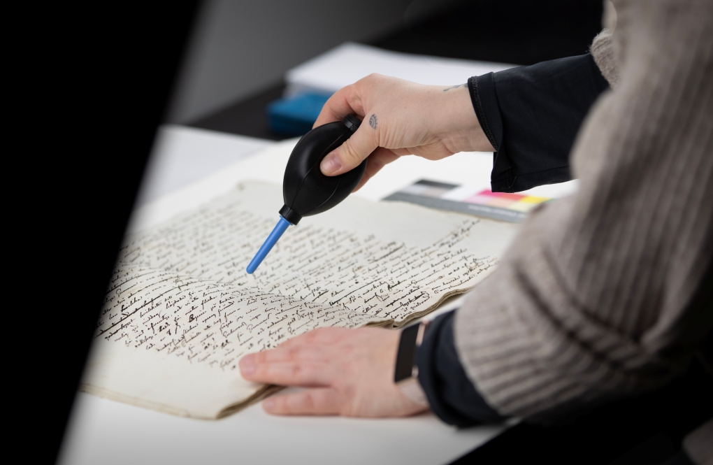 Vägen från fysiskt dokument till digitalt innehåller mycket mera än bara en skanner. Originaldokumenten finns alltid förtecknade och hela processen börjar med att en arkivarie tar fram denna förteckning. Sedan öppnar hen mapparna i tur och ordning och går igenom dokumenten eller fotografierna, ser till att de ligger på rätt plats. Under årens lopp, med många kunder som har bläddrat i mapparna, har ordningen inte alltid bibehållits precis som i förteckningen. Ibland händer det också att en arkivarie kan identifiera till exempel ett brev där en tidigare arkivarie har antecknat ”okänd avsändare”. Då byter brevet plats och placeras in i alfabetisk ordning enligt avsändarens namn. När allt ligger rätt i mappen förses varje dokument med en pappersremsa där arkivarien antecknar dess filnamn, en löpande numrering.