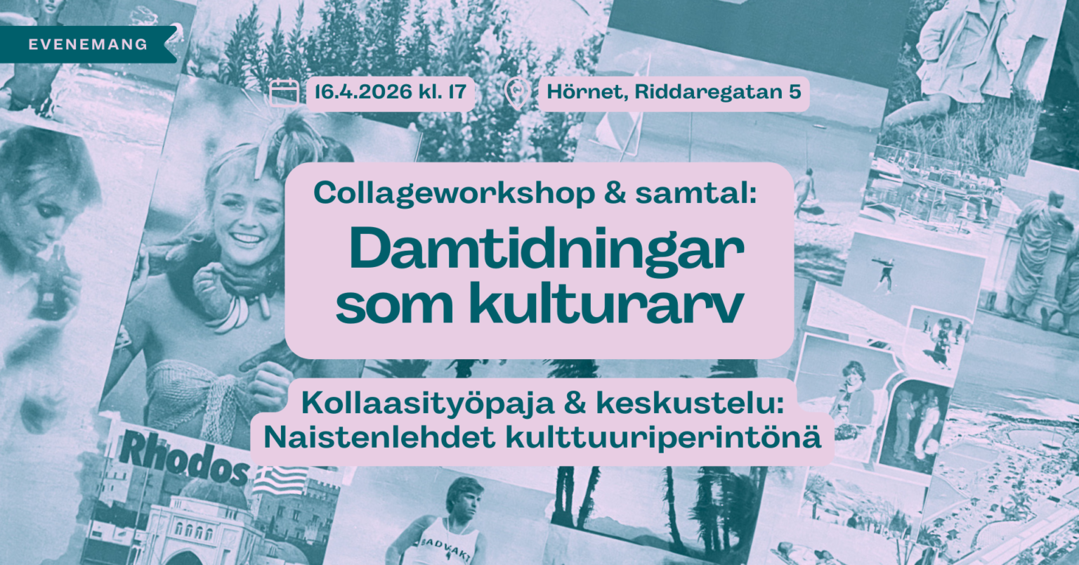 Under denna tvåspråkiga kväll samlas vi kring ett bord fyllt av tidningar från olika decennier. Tillsammans med forskarna Arja Turunen och Anna Niiranen samtalar vi om minnen och erfarenheter av damtidningar. Vi bekantar vi oss med tidningarnas innehåll och möjligheter till kreativt återbruk genom collage. Vi erbjuder material för collagepysslet och bjuder också på dryck och lättare tilltugg.